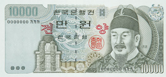 현재 유통 중인 노란색 만원권 이전 버전입니다.